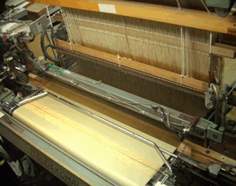 柔軟にした木材をさらに0.6o幅に細かく切って糸状(木の糸)にします。 この木の糸を織り機の横糸に使い、織りあげたものが"木織"です。 木織は、着物の帯などに金糸銀糸を織り込む伝統的な技法『引箔織り』で織り上げます。
